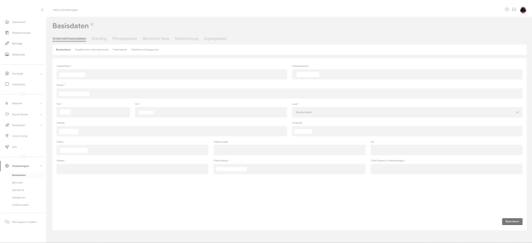 Im Bereich Einstellungen unter Basisdaten siehst du Angaben zu deinem Unternehmen und kannst diese verwalten. Zu Beginn musst du hier einige Angaben hinterlegen. Im Reiter Unternehmensdaten gibst du die Kontaktdaten deines Unternehmens an. Die mit einem Stern markierten Felder sind Pflichtangaben. Alle anderen Felder sind freiwillige Angaben.
