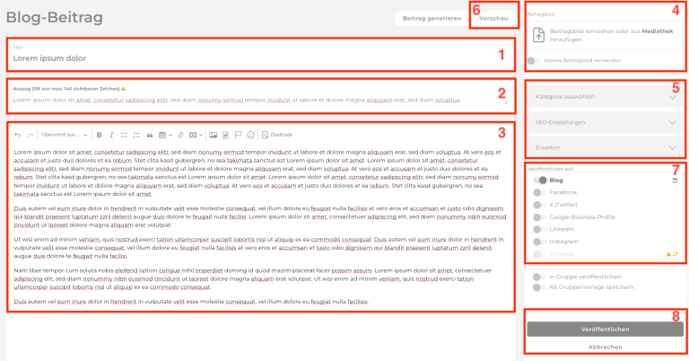 Zu guter Letzt kannst du den Beitrag als Entwurf speichern, solltest du noch keine Kanäle aktiviert haben, oder ihn veröffentlichen (8).