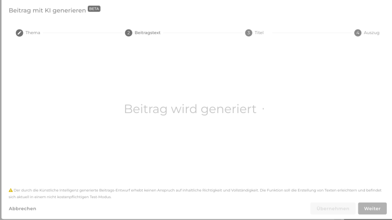 Hast du Weiter gewählt, wird dir im nächsten Feld der Beitragstitel generiert. Warte, bis dieser geladen ist und erscheint und klicke auf Weiter, wenn du einen Auszug generieren lassen willst oder auf Übernehmen, wenn du den Auszug selbst formulieren möchtest.