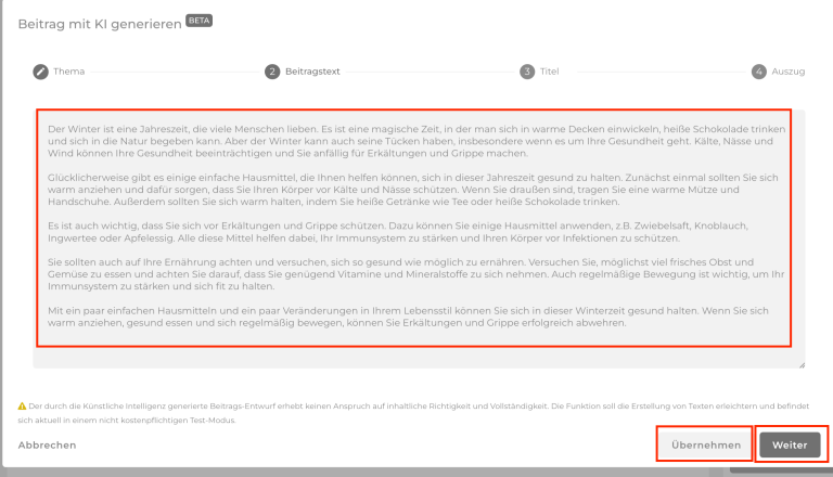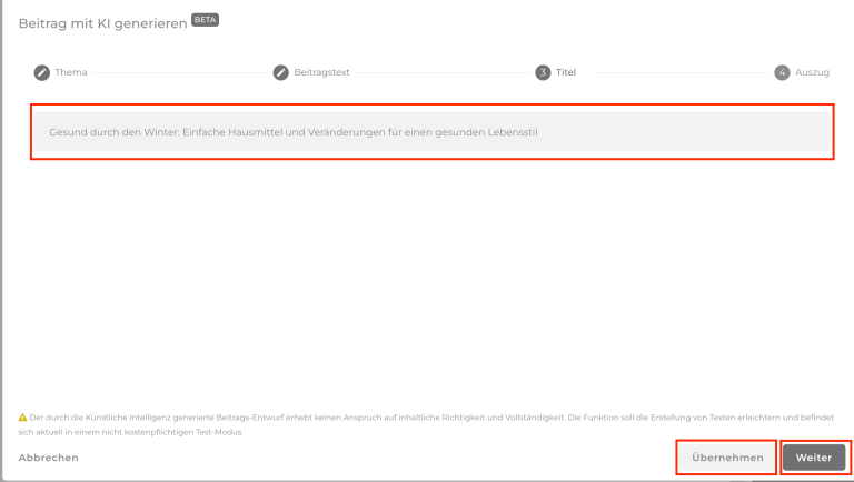 Sobald ein Text erscheint, kannst du mit Weiter bestätigen, sofern auch ein Titel für dich generiert werden soll. Reicht dir nur der Text und möchtest du den Rest selbst formulieren, so bestätige mit Übernehmen.