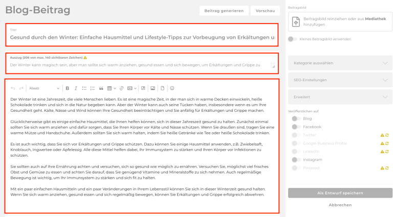 Sämtliche generierte Inhalte erscheinen nun in deinem Beitrag und du kannst den Beitrag weiter bearbeiten.