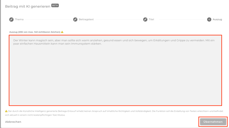 Hast du Weiter gewählt, wird im nächsten Abschnitt dein Auszug generiert. Warte, bis der Text erscheint. Übernimm alle generierten Inhalte mit einem Klick auf Übernehmen.