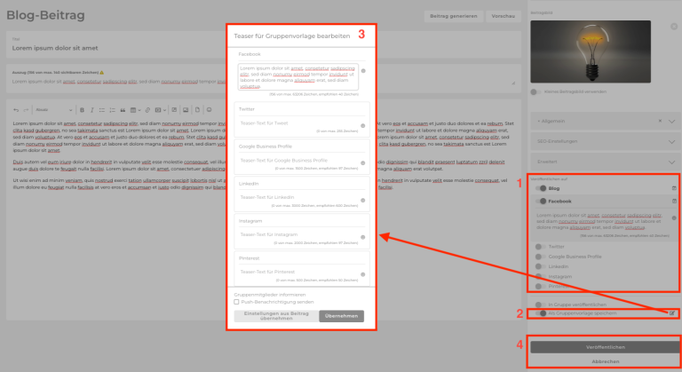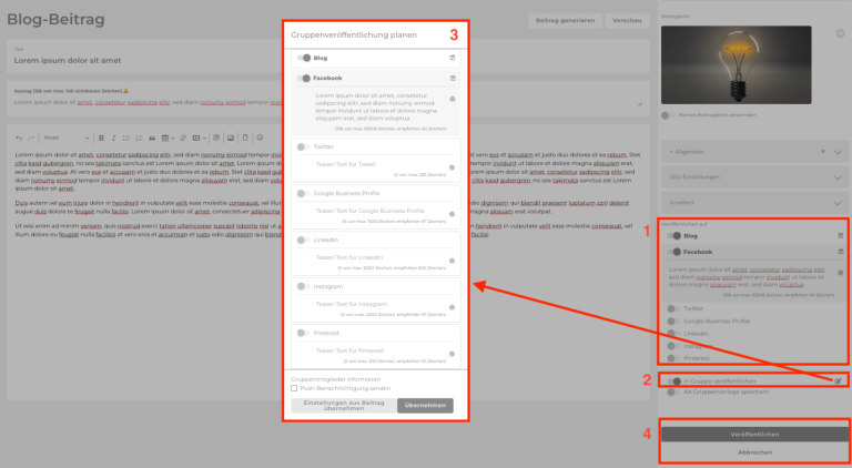 - Gewünschte Kanäle der Gruppenmitglieder zur Veröffentlichung und Zeitplan auswählen und Teaser eingeben/übernehmen