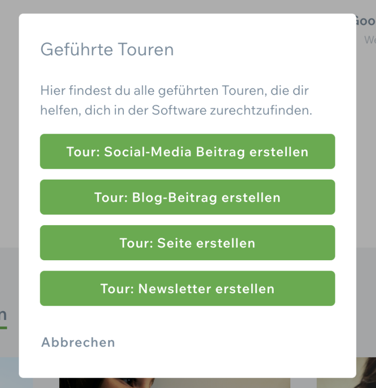 Bei Klick auf die Geführten Touren gelangst du zu einer Auswahl an Touren, die dich Schritt für Schritt durch die Funktionen von COCO führen, wie zum Beispiel die Erstellung einer Seite. Klicke einfach die gewünschte Tour an, und schon startet sie.