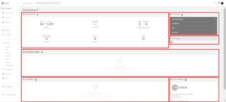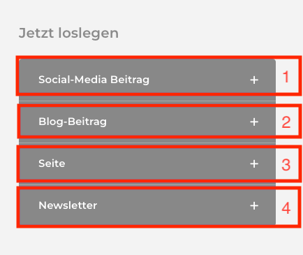 In diesem Bereich gelangst du direkt zur Erstellung eines Social-Media-Beitrags (1), Blog-Beitrags (2), einer Seite (3) oder eines Newsletters (4).