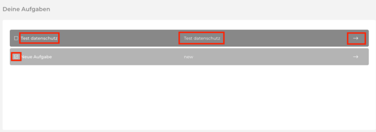 Rechts neben dem Kästchen siehst du die Bezeichnung der Aufgabe. Mittig befindet sich die Beschreibung. Der Pfeil rechts in der Aufgabe verlinkt dich zur jeweiligen Stelle oder einem Dokument, das dazu dient, die Aufgabe zu erledigen.
