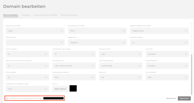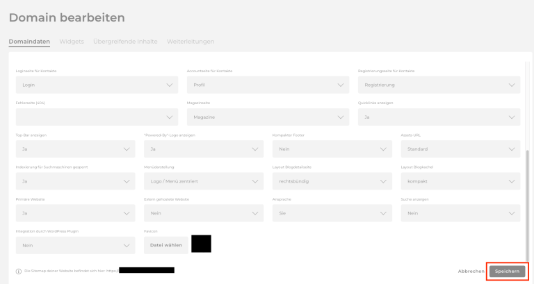 Durch einen Klick auf Speichern sicherst du deine Eingaben. Nachdem du deine Domain hinterlegt hast, wird dir in den Domaineinstellungen auch die URL deiner Sitemap angezeigt. Diese kannst du im Anschluss bei der Google Search Console verlinken.