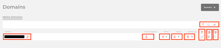 Für jede Domain siehst du links die Domain-Adresse (2) und rechts die Cookie-Akzeptanz (3). Daneben wird dir angezeigt, ob es sich um eine primäre (4) oder externe (5) Domain handelt und ob diese indexiert wird (6). Über die Icon daneben kannst du die Domain in einem neuen Tab öffnen (7), den Wartungsmodus aktivieren (8) oder sie löschen (9). Mit einem Klick auf die Domain-Adresse (2) kannst du eine bestehende Domain bearbeiten.