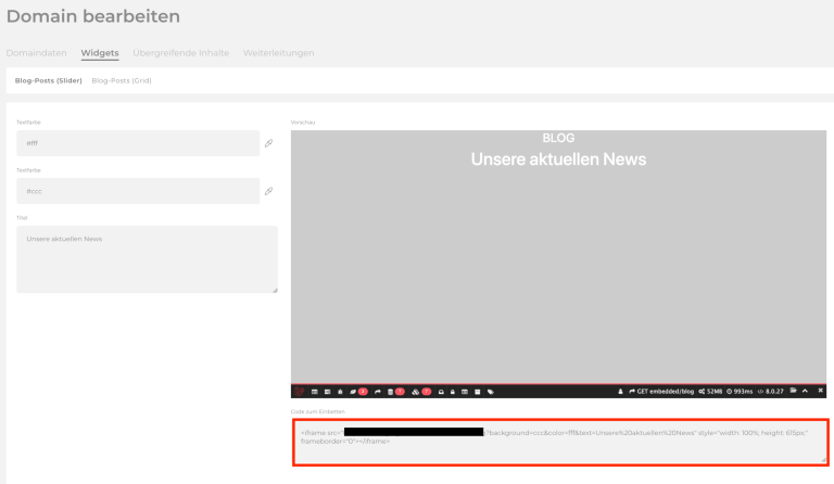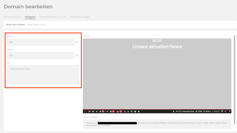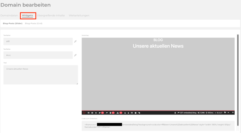 Deine Blog-Posts kannst du als Widget auf einer bestehenden Seite einbinden. Du hast die Optionen, sie als Grid oder Slider einzubinden. Unter Website > Domains findest du den Code zum einbetten. Öffne mit einem Klick auf deine Domain rechts den Bereich Widgets.