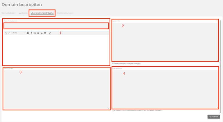 Unter Website > Domains > Übergreifende Inhalte hast du in der rechten Spalte die Möglichkeit, einen eigenen Text im Footer einzubinden. Gib dazu im Textfeld eine Überschrift und deinen Text ein.