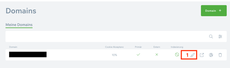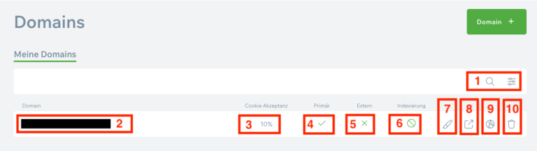 Für jede Domain siehst du links die Domain-Adresse (2) und rechts die Cookie-Akzeptanz (3). Daneben wird dir angezeigt, ob es sich um eine primäre (4) oder externe (5) Domain handelt und ob diese indexiert wird (6). Über die Icons daneben kannst du das Design der Domain bearbeiten (7) die Domain in einem neuen Tab öffnen (8), den Wartungsmodus aktivieren (9) oder sie löschen (10). Mit einem Klick auf die Domain-Adresse (2) kannst du eine bestehende Domain bearbeiten.