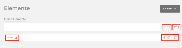 Über die beiden Icons kannst du das Element kopieren und löschen (4). Mit einem Klick auf die Elementbezeichnung (3) kannst du ein bestehendes Element bearbeiten.