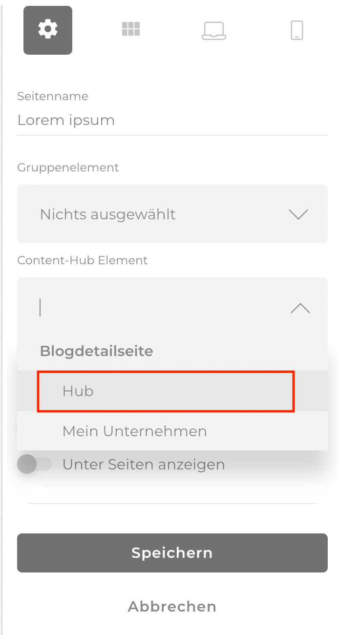 - Wähle unter Content Hub Element die Option Blogdetailseite > Hub aus