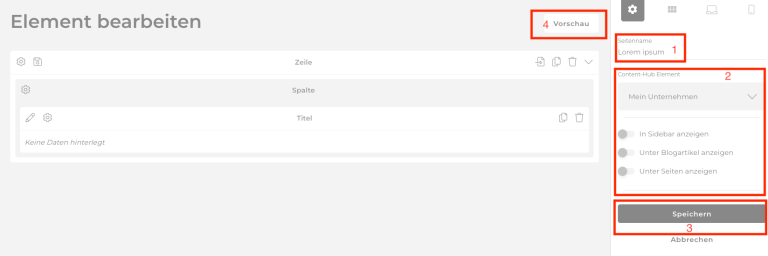 Damit du ein Element speichern kannst, müssen alle Pflichtfelder mit Inhalten gefüllt werden. Das ist beim Element nur der Seitenname (1). Über die weiteren Einstellungen (2) kannst du dein Element einem Hub zuordnen oder in bestimmten Bereichen automatisch anzeigen. Mit einem Klick auf Speichern (3) hast du ein neues Element erstellt. Während du das Element erstellst kannst du dir jederzeit eine Vorschau des Elements ansehen (4).