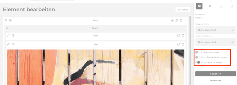 Darüber hinaus kannst du Elemente unter allen Beiträgen oder in der Sidebar deines Blogs anzeigen. Aktiviere dazu die Option “Unter Blogartikel anzeigen” und/oder “In Sidebar anzeigen”. Möchtest du Elemente nur unter einzelnen Beiträgen einbinden erfährst du hier wie.