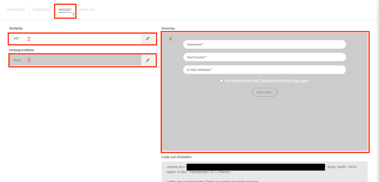 Im Bereich Widget (1) des Formulars kannst du die Textfarbe (2) und die Hintergrundfarbe (3) für das Formular einstellen. Im Feld für die Vorschau (4) siehst du dann, wie das Formular auf deiner Website aussehen wird.