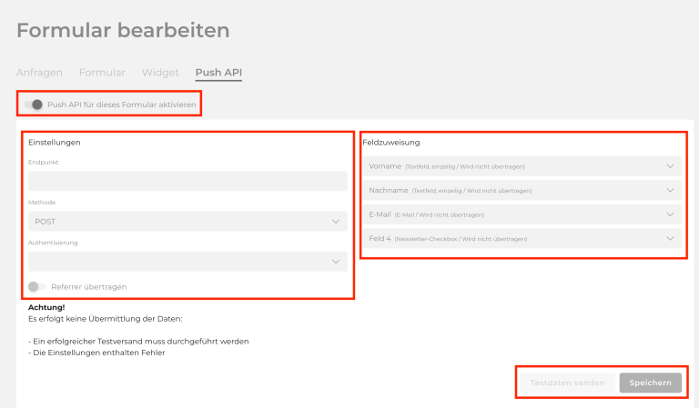 Im Bereich Push-API eines Formulars kannst du ein externes System wie z. B. ein CRM-System mit deinem Formular verknüpfen. Aktiviere dazu die Push API für dieses Formular und konfiguriere den Datenstrom.