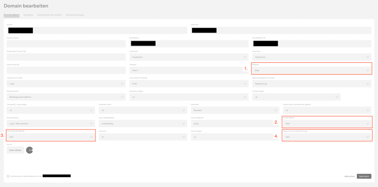 Die benötigten Daten kannst du bei der in COCO eingerichteten externen Domain im Reiter Wordpress Plugin einsehen. Der Pfad der Übersichtsseite muss dem Pfad deiner für die Domain hinterlegten Blogseite entsprechen.
