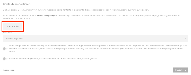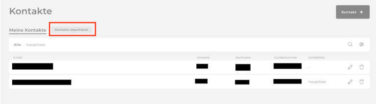 Um Kontakte aus deiner vorhandenen Datenbank zu importieren, klicke auf Kontakte importieren und wähle die passende Datei auf deinem Laufwerk aus.