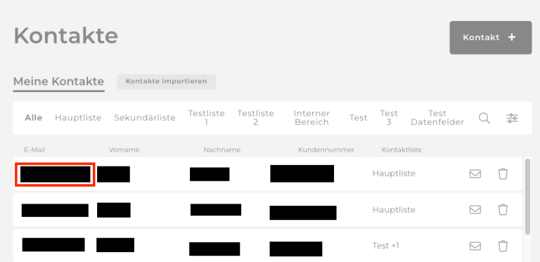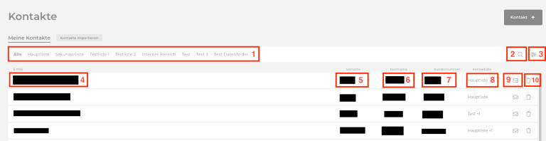Für jeden Kontakt siehst du links die E-Mail (4) und rechts den Vornamen (5) sowie den Nachnamen (6). Falls hinterlegt, wird dir auch die Kundennummer (7) und die Kontaktliste (8), der der Kontakt zugeordnet ist, angezeigt.