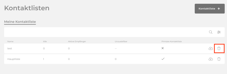 Mit dem Papierkorb kannst du eine Kontaktliste löschen. Damit werden nicht die in der Liste enthaltenen Empfänger gelöscht. Sie bleiben in der Kontaktliste, sind jedoch nicht mehr dieser Empfängerliste zugeordnet.