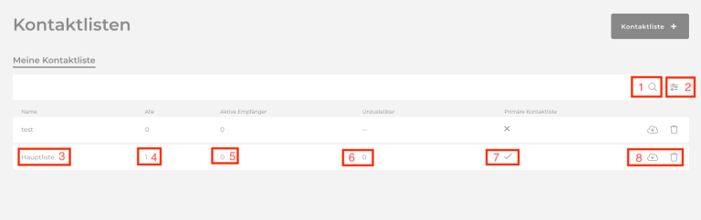 Für jede Kontaktliste siehst du links den Namen der Kontaktliste (3), dann die Gesamtanzahl der Empfänger innerhalb der Kontaktliste (4) und daneben die Anzahl der aktiven Empfänger innerhalb der Kontaktliste (5). Daneben wird angezeigt, bei wie vielen Kontakten Newsletter unzustellbar (6) waren und außerdem kannst du auch sehen, ob es sich um eine primäre Kontaktliste (7) handelt.