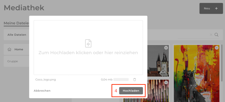 Bevor du ein Bild oder Dokument auf einer Seite einbinden kannst, musst du es zuerst in deine Mediathek hochladen.