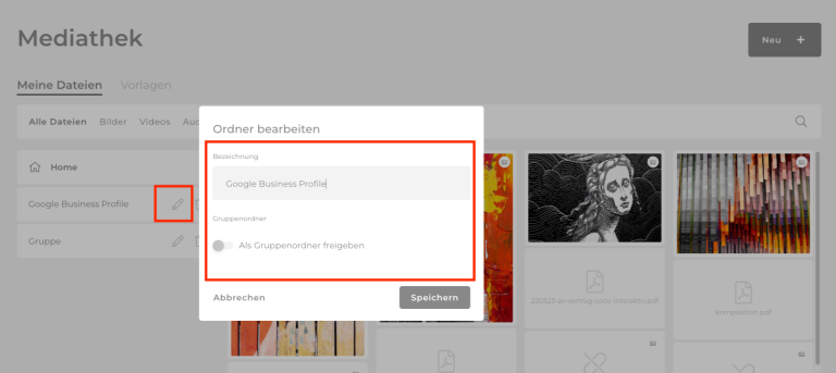 Um die Bilder und Dateien zu strukturieren, kannst du sie in Ordner verschieben. Mit einem Klick auf Neu >Neuer Ordner kannst du den Ordner benennen und musst die Erstellung mit einem Klick auf Speichern bestätigen.