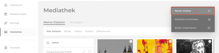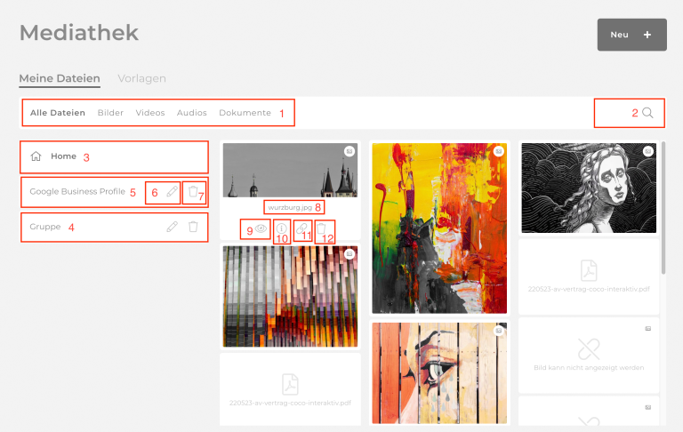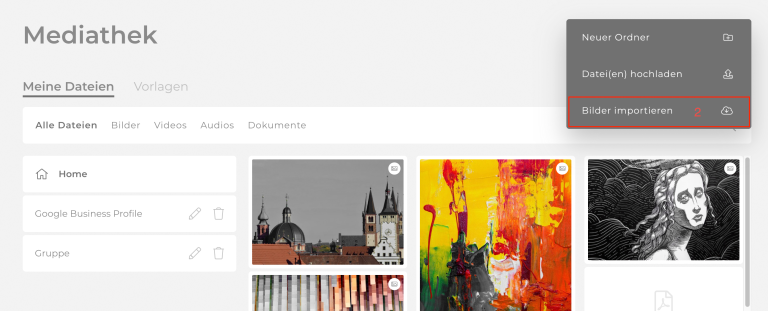 Im Bereich Mediathek siehst du alle bisher importierten und hochgeladenen Dateien. Über die Auswahl oben kannst du alle Dateien, oder auch nur Bilder, Videos, Audios und Dokumente anzeigen (1). Über das Eingabefeld und die Lupe rechts (2) kannst du nach heruntergeladenen oder importierten Bildern suchen.