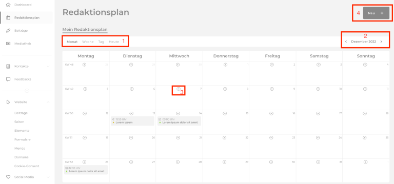 In der Monatsansicht kannst du über das Plus in den einzelnen Tagen (3) und darüber hinaus in der Darstellung sämtlicher Zeiträume über den Neu + (4) Button rechts oben einen Blogbeitrag, Social-Media-Beitrag und Newsletter planen und erstellen.