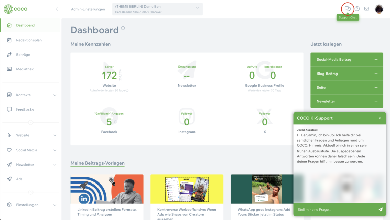 • Direkteingabe von Fragen im COCO KI-Support Chat (aufrufbar über das Support-Chat Icon in der Kopfzeile oder über den "Hilfe & Support"-Button auf dem Dashboard)