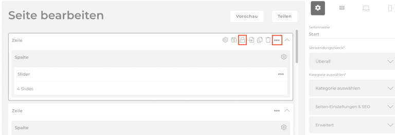 Bei Zeilen und Modulen kannst du über einen Klick auf die drei Punkte und dann auf das Schloss den Zugriff und damit auch die Sichtbarkeit von Zeilen und Modulen für einzelne Kontakte und Kontaktlisten steuern.