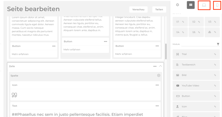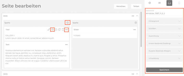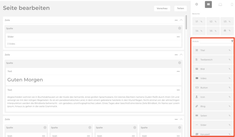In den Spalten kannst du nun die gewünschten Module per Drag-and-Drop platzieren. Über einen Klick in das Modul oder auf das Stift-Icon kannst du deine Inhalte einfügen oder ändern. Die Änderungen bestätigst du mit einem Klick auf Speichern.