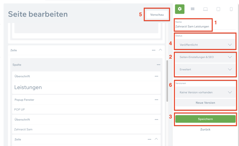 Damit du deine Seite speichern oder veröffentlichen kannst, müssen alle Pflichtfelder mit Inhalten gefüllt werden. Das ist bei der Seite nur der Name (1) für die Seite. Über die weiteren Einstellungen (2) kannst du deine Seite z.B. einer Kategorie zuordnen. Mit einem Klick auf Speichern (3) hast du je nach gewähltem Status (4) deine die neue Seite erstellt und als Entwurf gespeichert, sie veröffentlicht oder zur Veröffentlichung eingeplant. Während du die Seite aufbaust, kannst du dir jederzeit eine Vorschau der Seite ansehen (5). Zusätzlich hast du die Möglichkeit, Versionen (6) von deiner Seite abzuspeichern, um wenn nötig, zu ihnen zurückzukehren.