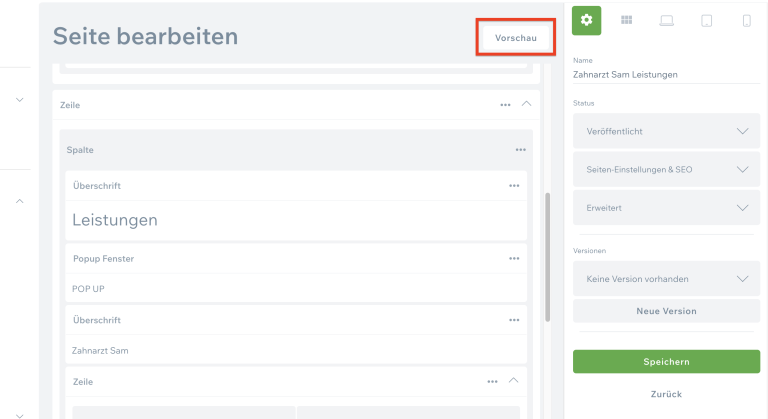 Während der Bearbeitung kannst du dir jederzeit eine Vorschau der Seite über Klick auf den Button ansehen.