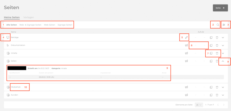 Über die beiden Icons kannst du den Beitrag kopieren und löschen (7). Klappst du die erweiterten Informationen aus (8) siehst du zudem Autor und Erstellungsdatum sowie den Zeitpunkt der Veröffentlichung (9). Mit einem Klick auf den Seitennamen (10) kannst du eine bestehende Seite bearbeiten.