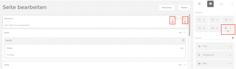 Bereiche gibt das Raster für deine Seite vor. Du kannst einzelne Zeilen mit einer unterschiedlichen Anzahl an Spalten auf deiner Seite platzieren. 1/2 bedeutet 1 Zeile mit 2 Spalten, 1/3 bedeutet 1 Zeile mit 3 Spalten etc. Mit den drei Würfeln kannst du ein Element importieren, das du auf mehreren Seiten benutzen, aber nur an einer zentralen Stelle editieren möchtest.