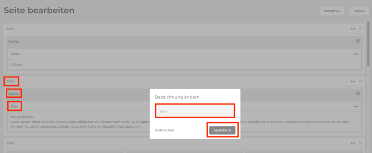 Um einen Überblick bei der Seitenbearbeitung zu behalten, kannst du durch einen Klick auf die Zeilen-, Spalten und Modulbezeichnung die Bearbeitung der Bezeichnung öffnen und dem Element einen neuen Namen geben.