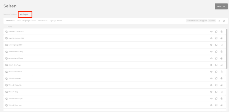 Unter Signage>Seiten oder Webseite>Seiten im Bereich Vorlagen kannst mit dem Auge alle Vorlagen ansehen. Mit dem Blatt Papier kannst du eine Vorlage für deine Seite verwenden.