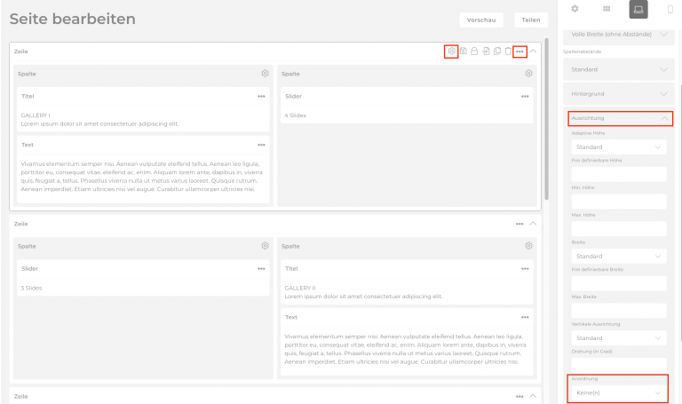 Bereiche gibt das Raster für deine Seite vor. Du kannst einzelne Zeilen mit einer unterschiedlichen Anzahl an Spalten auf deiner Seite platzieren.
