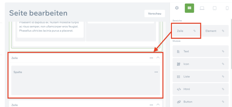 Bereiche gibt das Raster für deine Seite vor. Du kannst einzelne Zeilen mit einer unterschiedlichen Anzahl an Spalten auf deiner Seite platzieren. Ziehe hierfür eine Zeile in die Struktur - Damit hast du eine Zeile mit einer Spalte zur Verfügung.