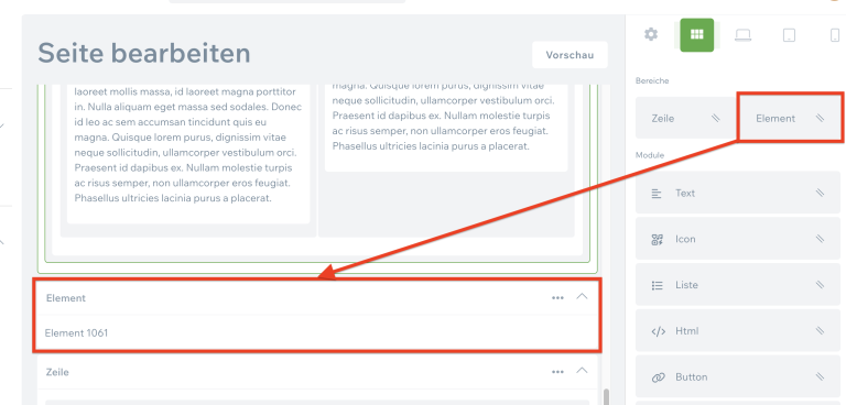 Ziehst du stattdessen ein Element statt einer Zeile in die Struktur, so kannst du ein Element importieren, das du auf mehreren Seiten benutzen, aber nur an einer zentralen Stelle editieren möchtest. Mehr dazu erfährst du im Bereich Elemente.