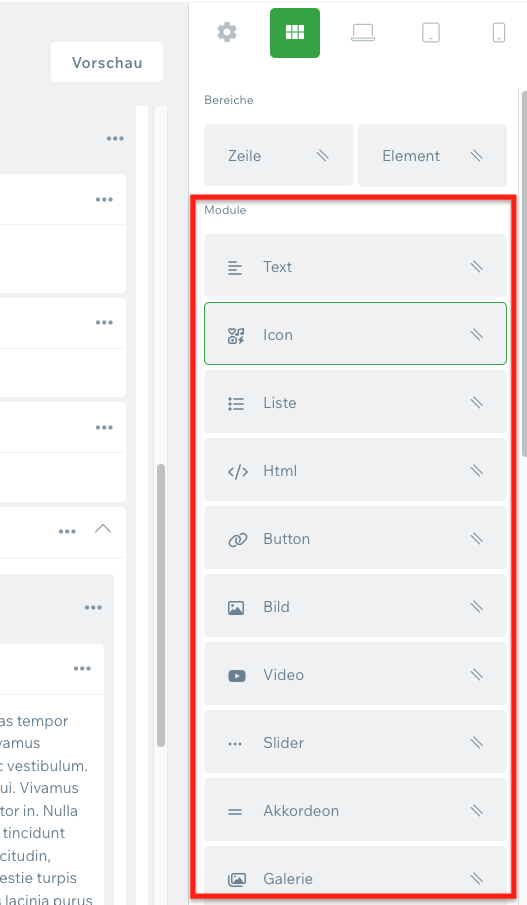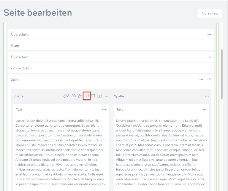 Mit dem Blatt-Icon kannst du Module, Spalten und Zeilen duplizieren.