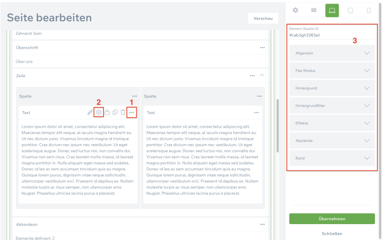 Mit einem Klick auf die drei Punkte (1) und dann das Zahnrad (2) bei einer Zeile oder einem Modul oder einem Klick auf das Zahnrad bei einer Spalte kannst du weitere Einstellungen (3) für eine Zeile, eine Spalte oder ein Modul vornehmen. Hier lässt sich beispielsweise ein Hintergrund festlegen, die Schrift anpassen und die Ausrichtung, Abstände und Umrandung einstellen.