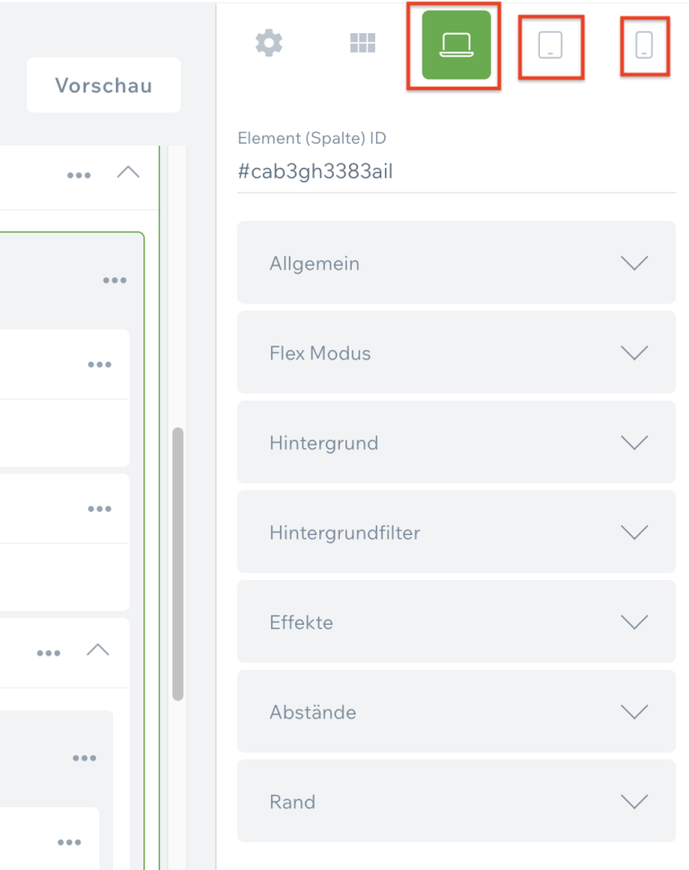 Fährt man über die drei Punkte und klickt auf dann auf das Zahnrad einer Zeile, Spalte oder eines Moduls, so öffnen sich automatisch die Desktop-Einstellungen. Diese werden automatisch in die anderen Ansichten übernommen. Möchtest du Einstellungen exklusiv für eine Ansicht vornehmen, stelle sicher, dass du das entsprechende Symbol für die Ansicht auswählst, bevor du Änderungen vornimmst.