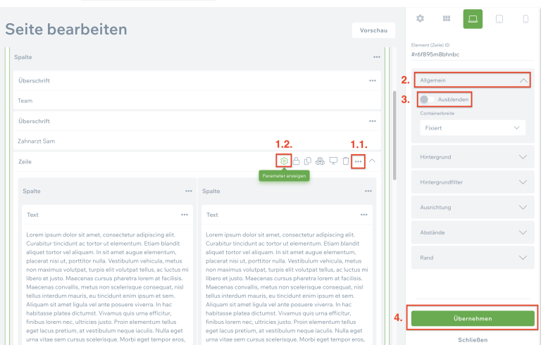Möchtest du eine ganze Zeile, Spalte oder Modul im Web (Frontend) ausblenden, ohne diese im System (Backend) zu löschen, wählst du nach Klick auf die dortigen Einstellungen (1.1. & 1.2.) Allgemein (2.) → Ausblenden (3.). Klicke anschließend auf Übernehmen (4.). Die Einstellung wird nur für die jeweilige Ansicht übernommen. Möchtest du dasselbe z.B. für mobile einstellen, musst du diese Einstellung dort unter Auswahl des Reiters nochmal vornehmen.