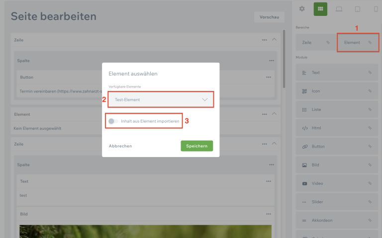 Möchtest du das Element auf dieser Seite editieren, so ziehe dir statt einer Zeile ein Element (1) aus den Bereichen, wähle das gewünschte Element aus dem Dropdown (2) und aktiviere den Regler Inhalt aus Element importieren (3).