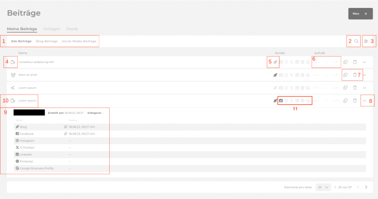Für jeden Beitrag siehst du links um welche Art es sich handelt (4) und rechts den Status (5). Daneben werden die Social-Media-Kanäle und ihr Status angezeigt (11). Aktiviere bitte unter filtern oder sortieren (3) den Regler für Kanäle, damit dir der Status und die Kanäle angezeigt werden. Außerdem werden dir die Aufrufe und Impressionen aus den letzten 7 Tagen angezeigt (6). Die serverseitigen Aufrufe werden ohne personenbezogene Daten und Cookies erhoben. Das bedeutet, dass ein Besucher durch das Neuladen des Beitrags mehrere Aufrufe generieren kann. Aus diesem Grund sind diese Zahlen weniger aussagekräftig und fallen deutlich höher aus. Wir empfehlen die Einrichtung von Google Analytics zur genaueren Auswertung des Erfolges deiner Online Kommunikation.