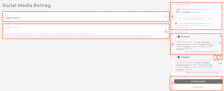 Zu guter Letzt kannst du den Beitrag als Entwurf speichern solltest du noch keine Kanäle aktiviert haben oder ihn veröffentlichen (6).