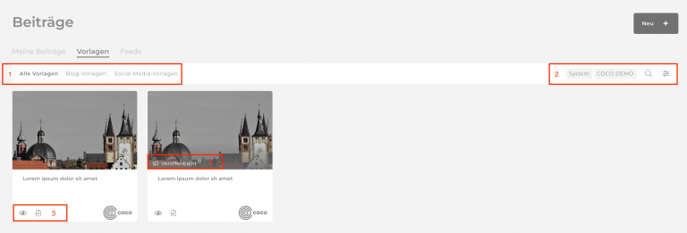 Mit einem Klick auf das Auge kannst du dir eine Vorschau der Vorlage ansehen. Mit einem Klick auf das Blatt Papier kannst du die Vorlage importieren und für einen eigenen Beitrag verwenden (3). Hast du eine Vorlage bereits verwendet wird dir dieser Hinweis auf dem Beitragsbild angezeigt (4).